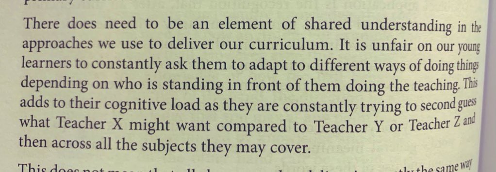 | You will have lots of new teachers. | In my experience this can cause as many problems as it can help ease situations. I recently tweeted a section from Emma Turner’s latest book Simplicitus that summed this up beautifully, see below! I often talk to pupils about how they should absolutely NOT change who they are. But in some circumstances they might need to find the appropriate version of themselves depending on the adult they are with. They already do this at school/home/family/ etc. and so this simply needs highlighting. Although secondary staff – this understanding is key for you! You may like the cheeky nature of Child A; but that same sense of humour would not be seen as appropriate in a colleagues class. Of course this is not an expectation that any member of staff should change their expectations, but please give the children more than one or 2 lessons to remember exactly what they are for each of the staff they are going to encounter! |